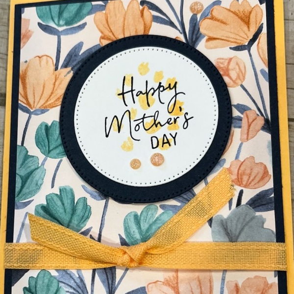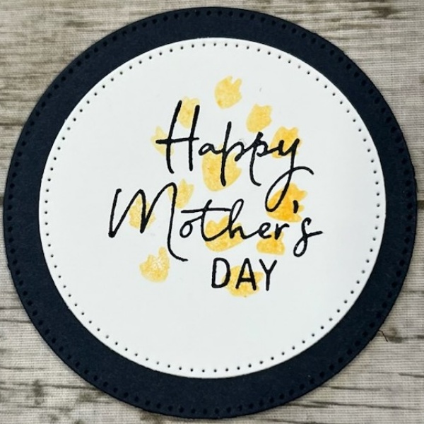 On the white circle, I stamped a floral image from the Sweet Blooms Stamp Set in Peach Pie ink, then added a sentiment – Happy Mother’s Day – in Secret Sea. (This sentiment comes from the retired Perennial Postage Stamp Set, which I still love using!)