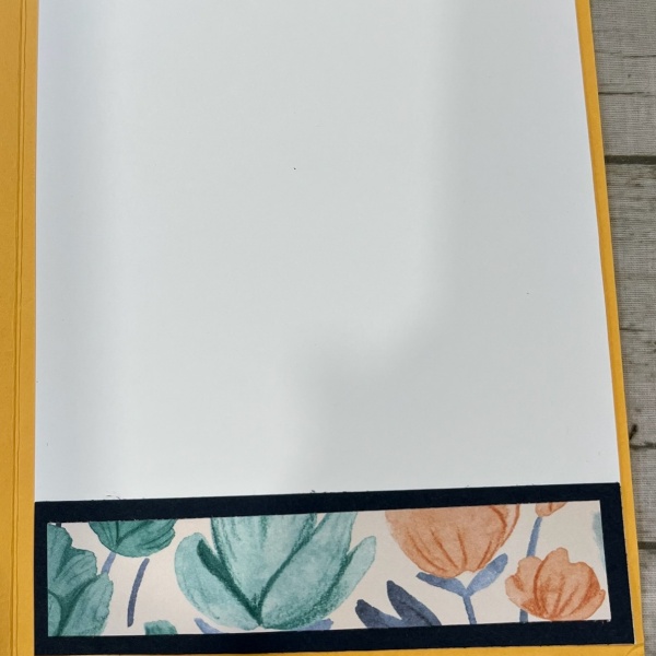 To keep the inside simple but elegant, I used a 1″ x 4″ strip of Secret Sea cardstock and layered a 3/4″ square of DSP on top. I adhered both pieces to a Basic White panel using liquid glue. This little accent ties the inside to the front of the card beautifully.