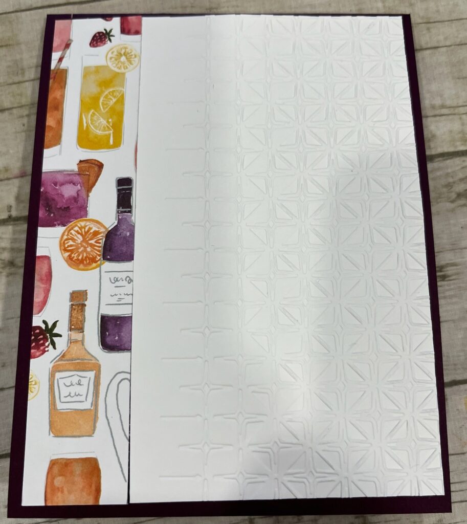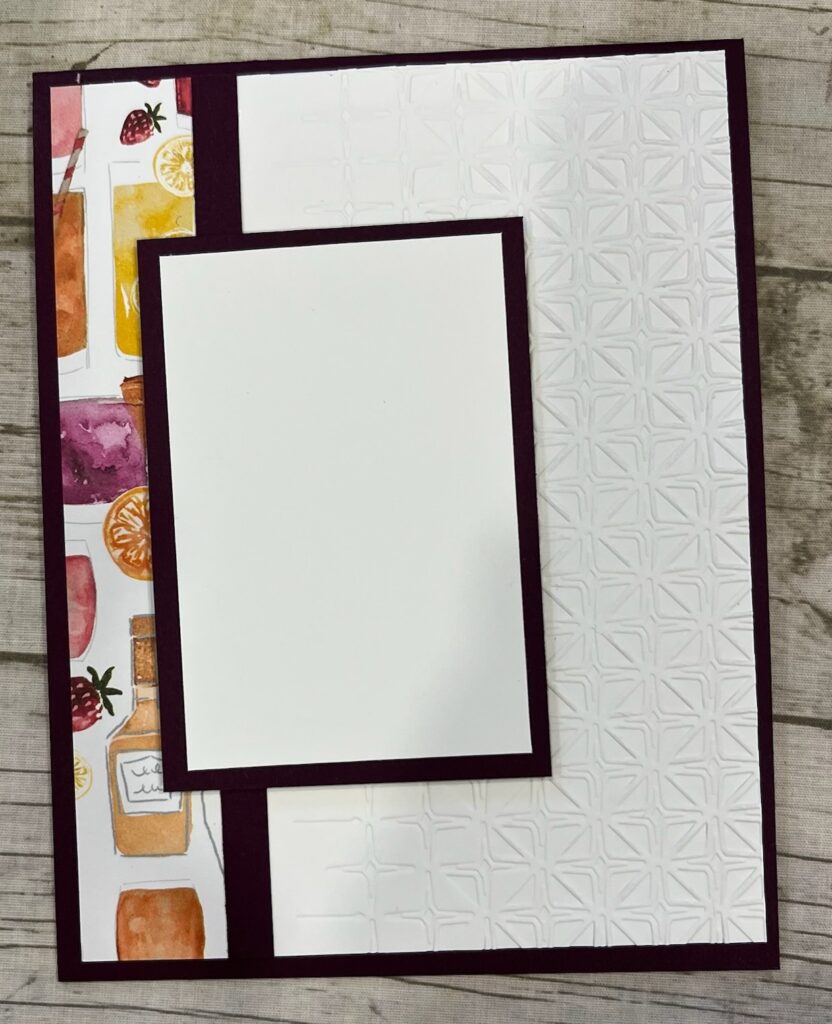 - To create a seamless transition between the embossed cardstock and the DSP, I adhered a thin strip of Blackberry Bliss card stock over the seam using liquid glue.
