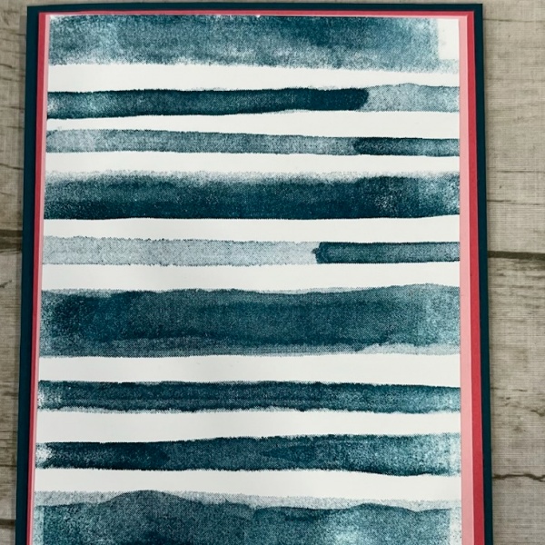 3. Top Layer – 5″ x 4 3/4″ in Basic White, Stamped using the Painted Stripes Cling Stamp set, which is another On-Line Exclusive.