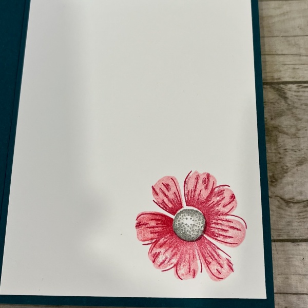 5. Stamp a large flower on the inside Basic White panel to coordinate with the front, then adhere it with glue.